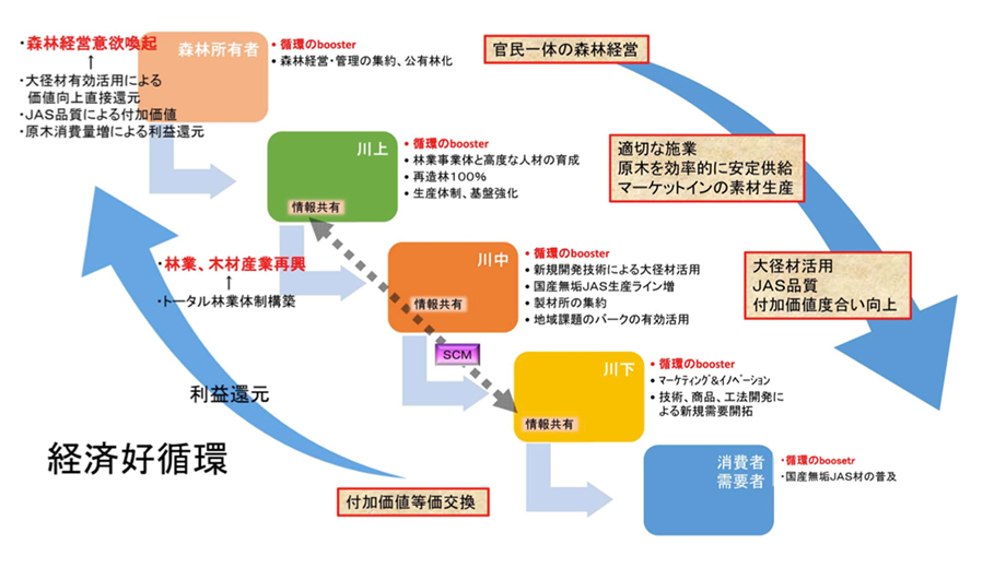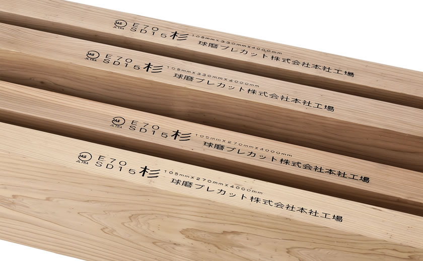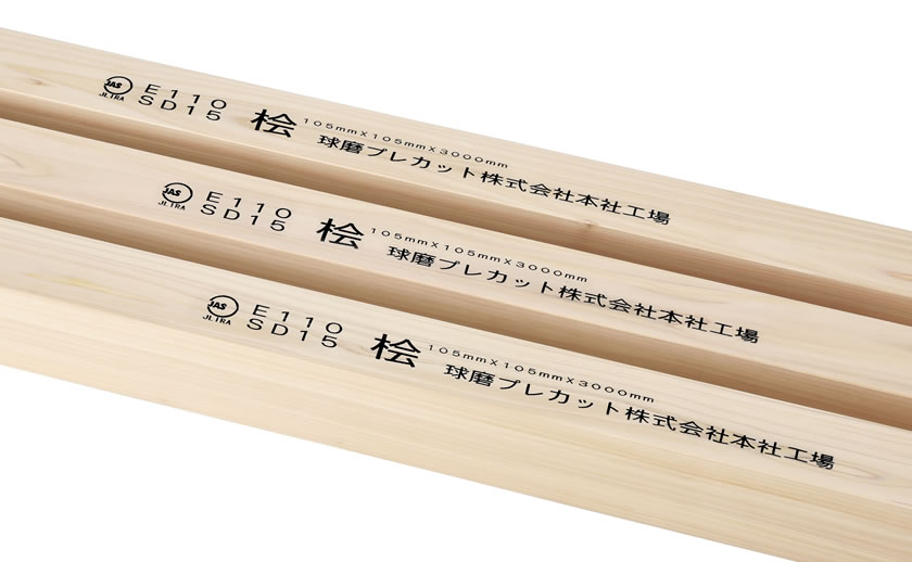 弊社も当団体に参加して、各種技術開発やその供給の一翼を担ってきました。現在は、地域林業の課題である大径材の付加価値有効活用を目的に開発した独自技術の「丸太状熱処理併用複合乾燥法を用いた芯去り製材技術:ウッドデザイン賞2016ソーシャルデザイン部門技術分野受賞」にて、構造用製材品のJAS規格(機械等級区分製材)供給に取り組んでいます。